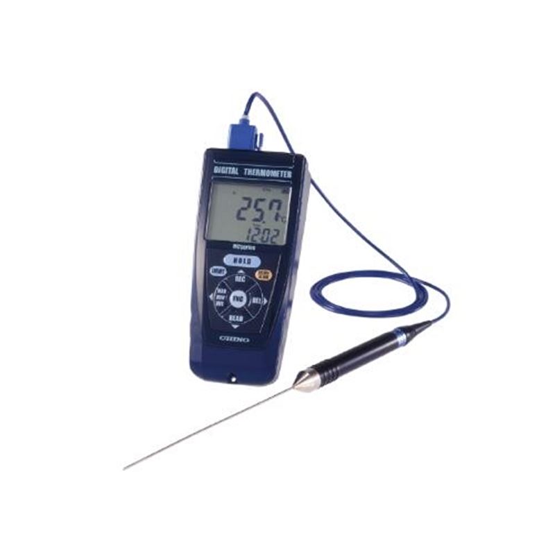 MC1000是一款具有大尺寸液晶显示屏(带背光)的便携式温度计。测量数据可以存储在主机中,最多20个数据。